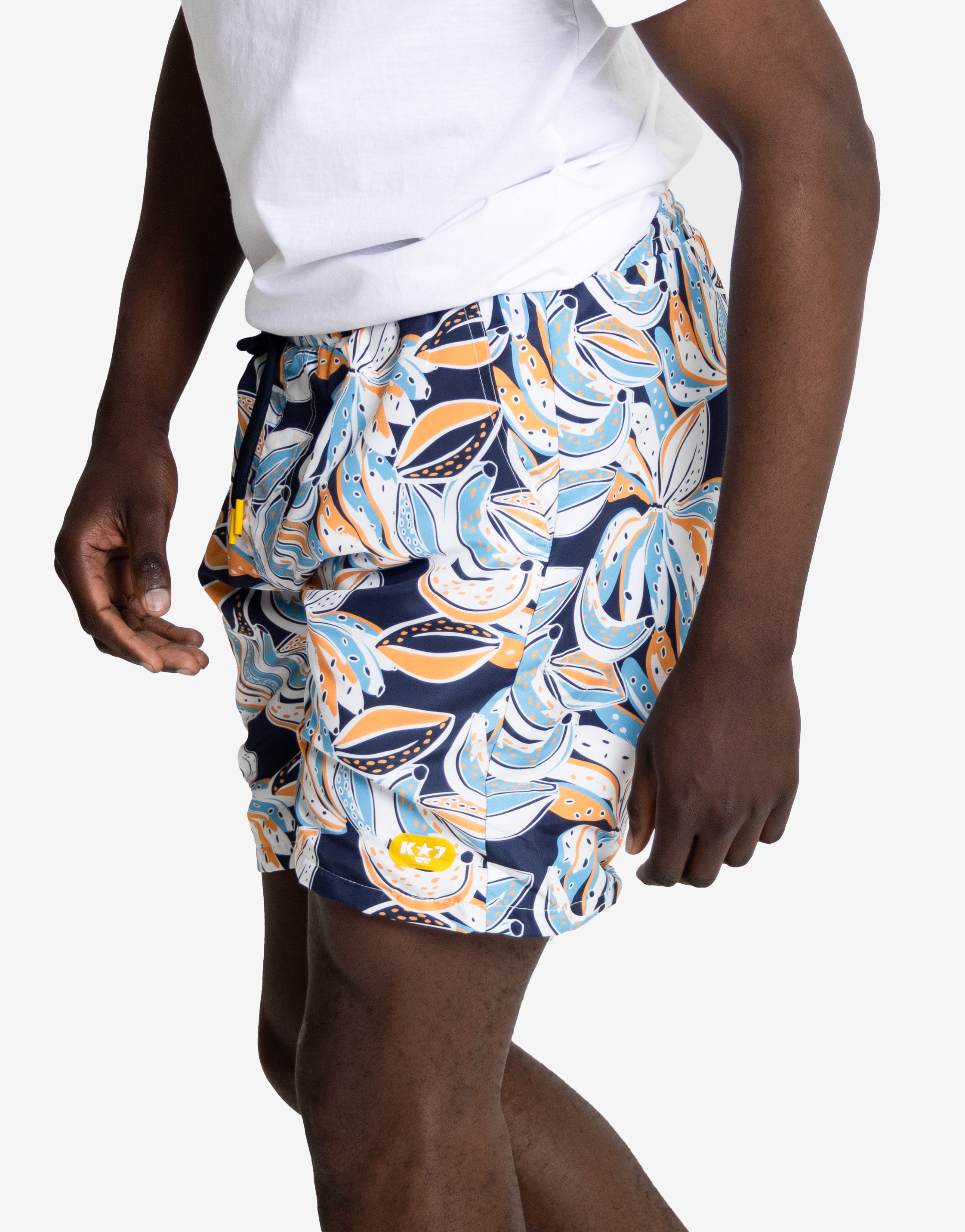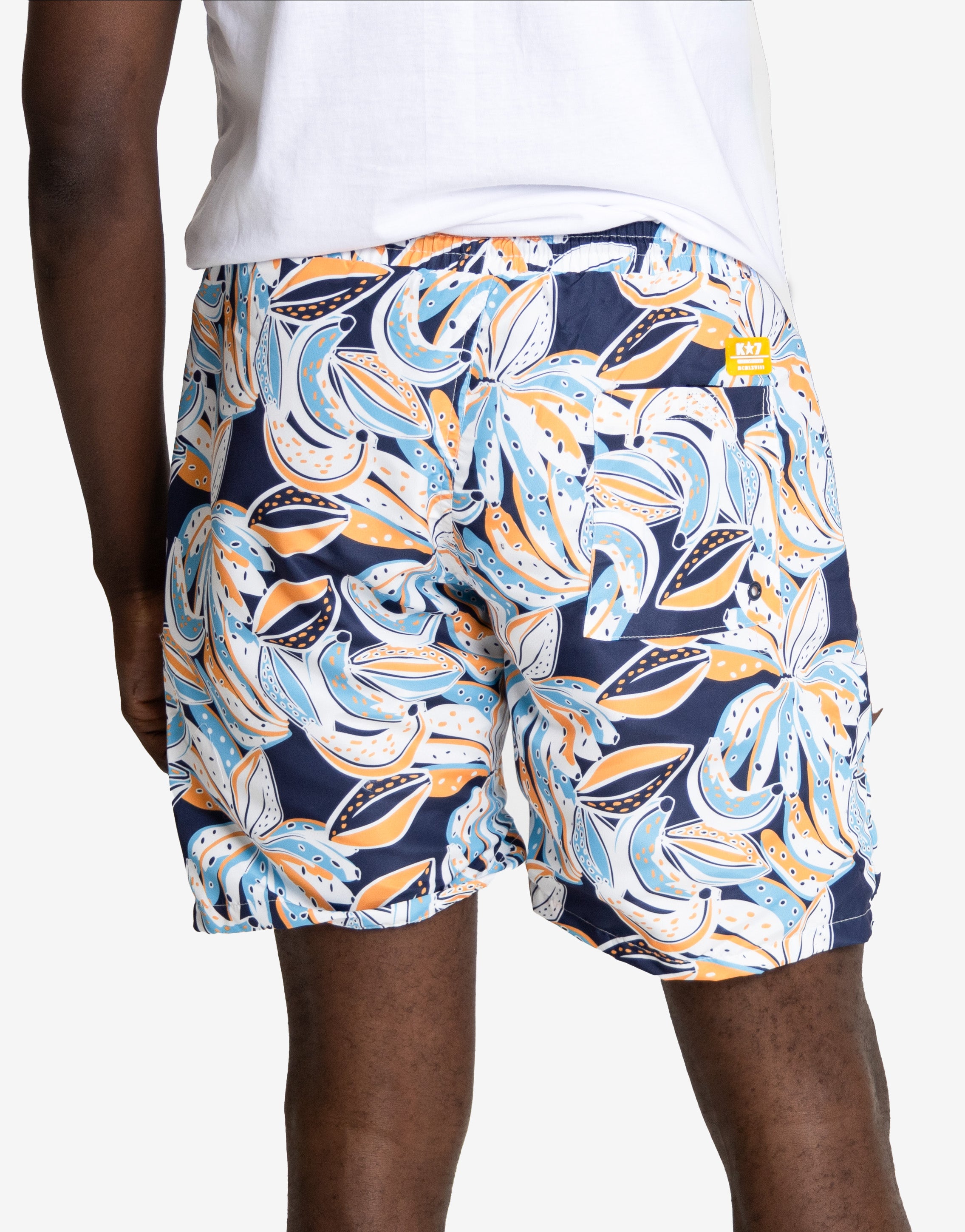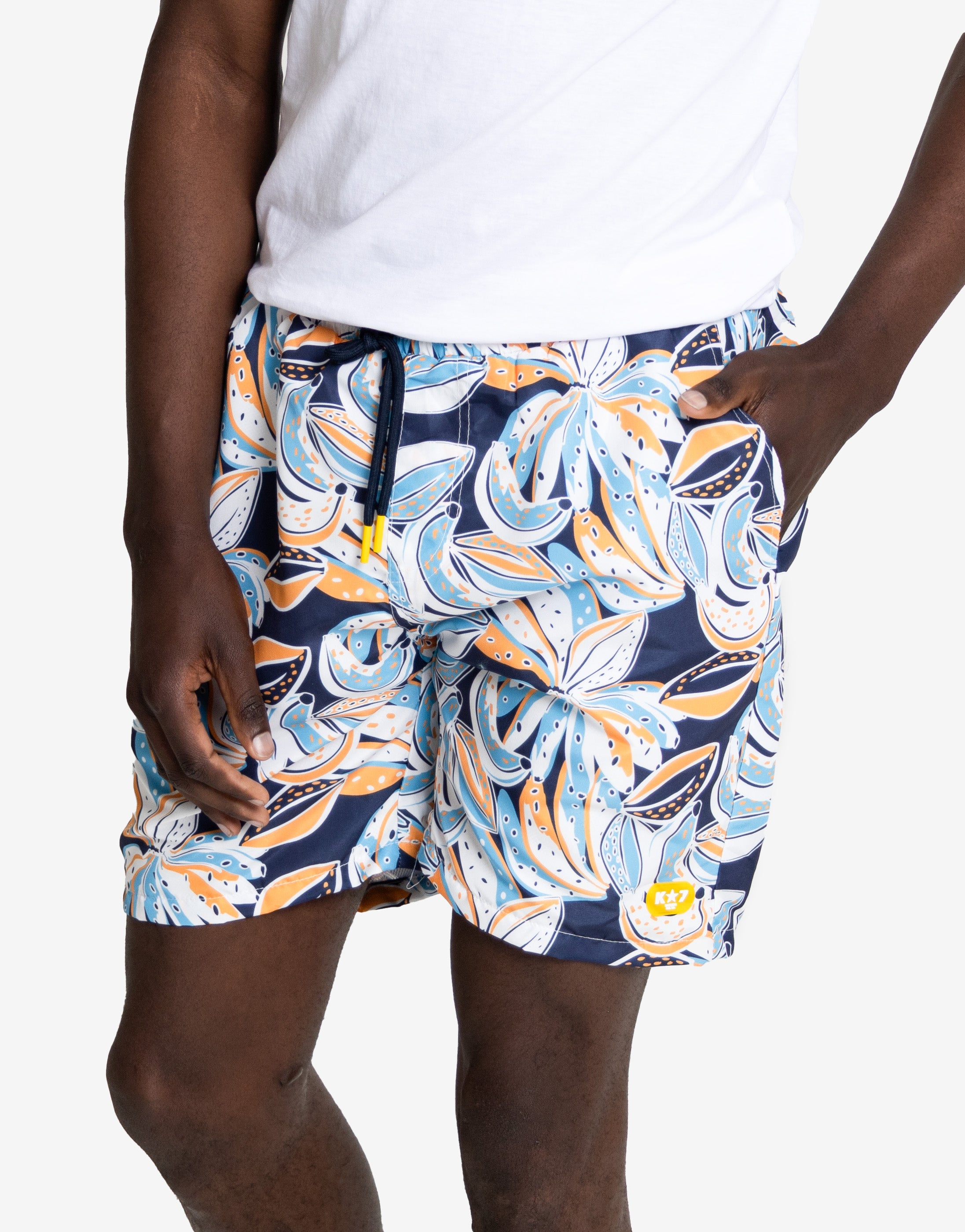 Brighten your summer look with the Simjee Swim Shorts. These shorts feature a lively, modern floral print in deep navy, refreshing blues, and warm yellow-orange accents. Designed for superior performance and vibrant style, the Simjee shorts are the perfect choice for any warm-weather outing, from beach vacations to poolside lounging.