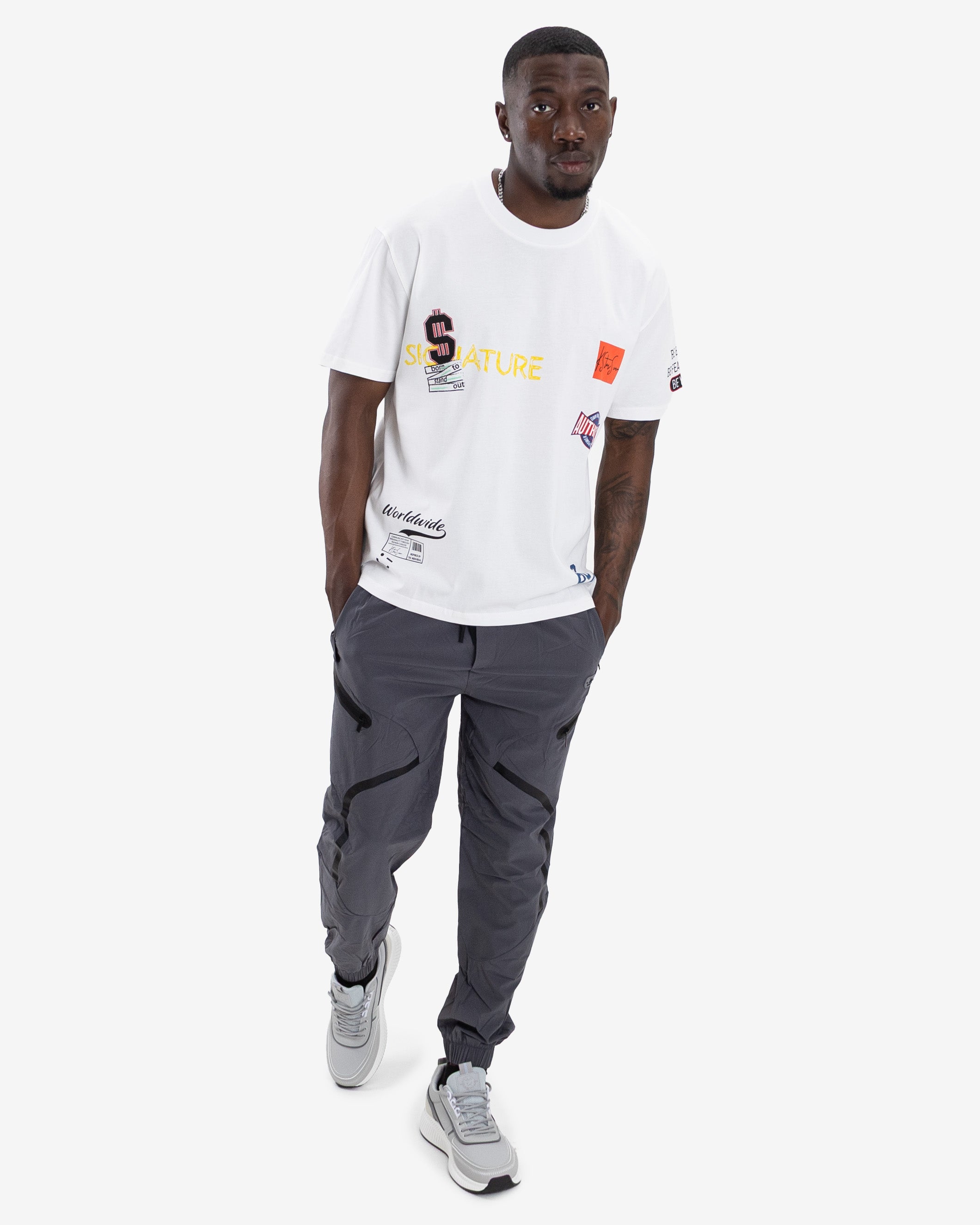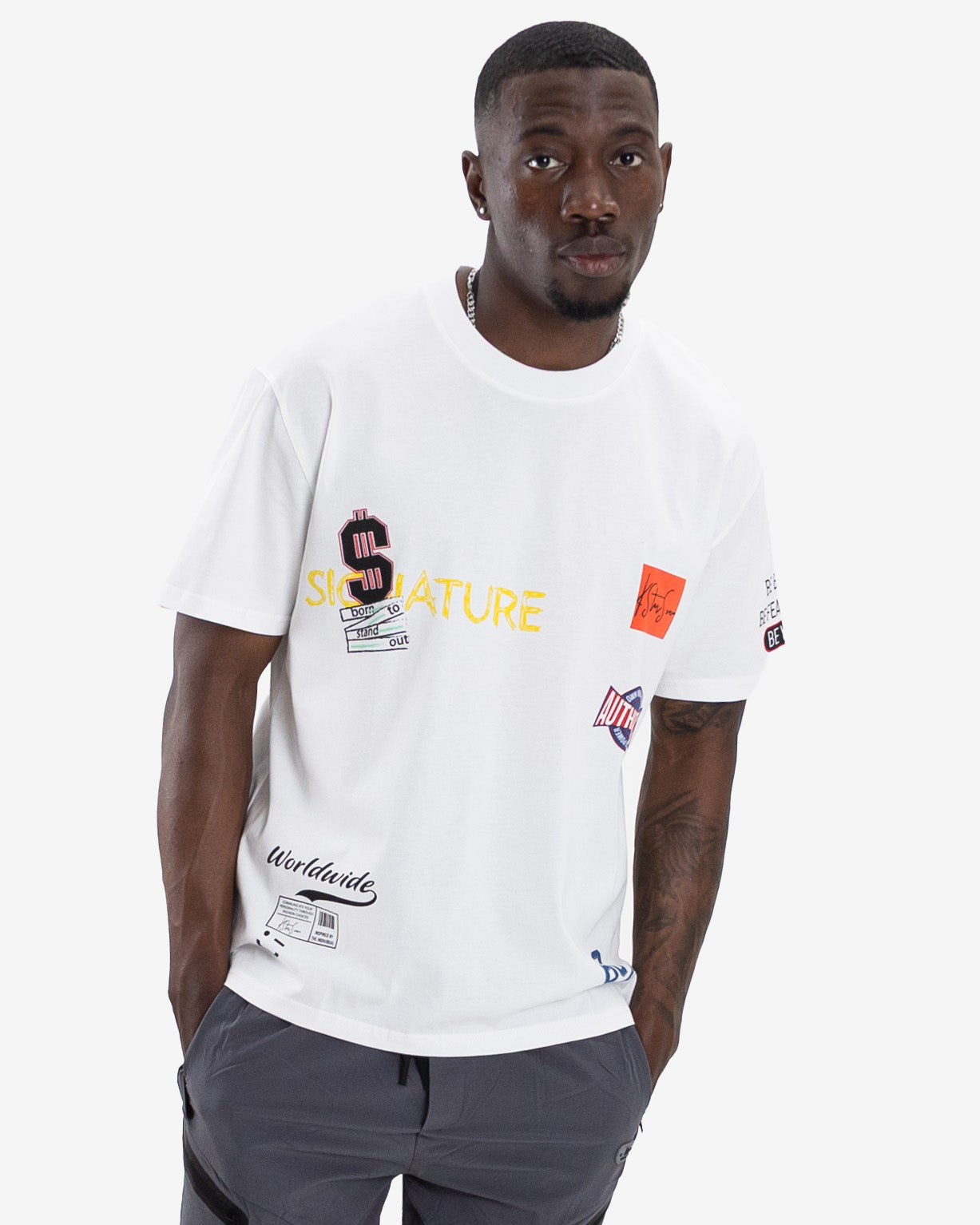 The Execute Tee from the Signature Collection is the ultimate expression of creative confidence. This isn't just a t-shirt; it's a wearable piece of art. The clean, comfortable feel of its soft fabric provides the perfect canvas for a dynamic collage of graphic patches and prints across the front. It’s a bold and modern piece for the individual who makes a statement with their style, offering a unique and versatile foundation for any curated look.