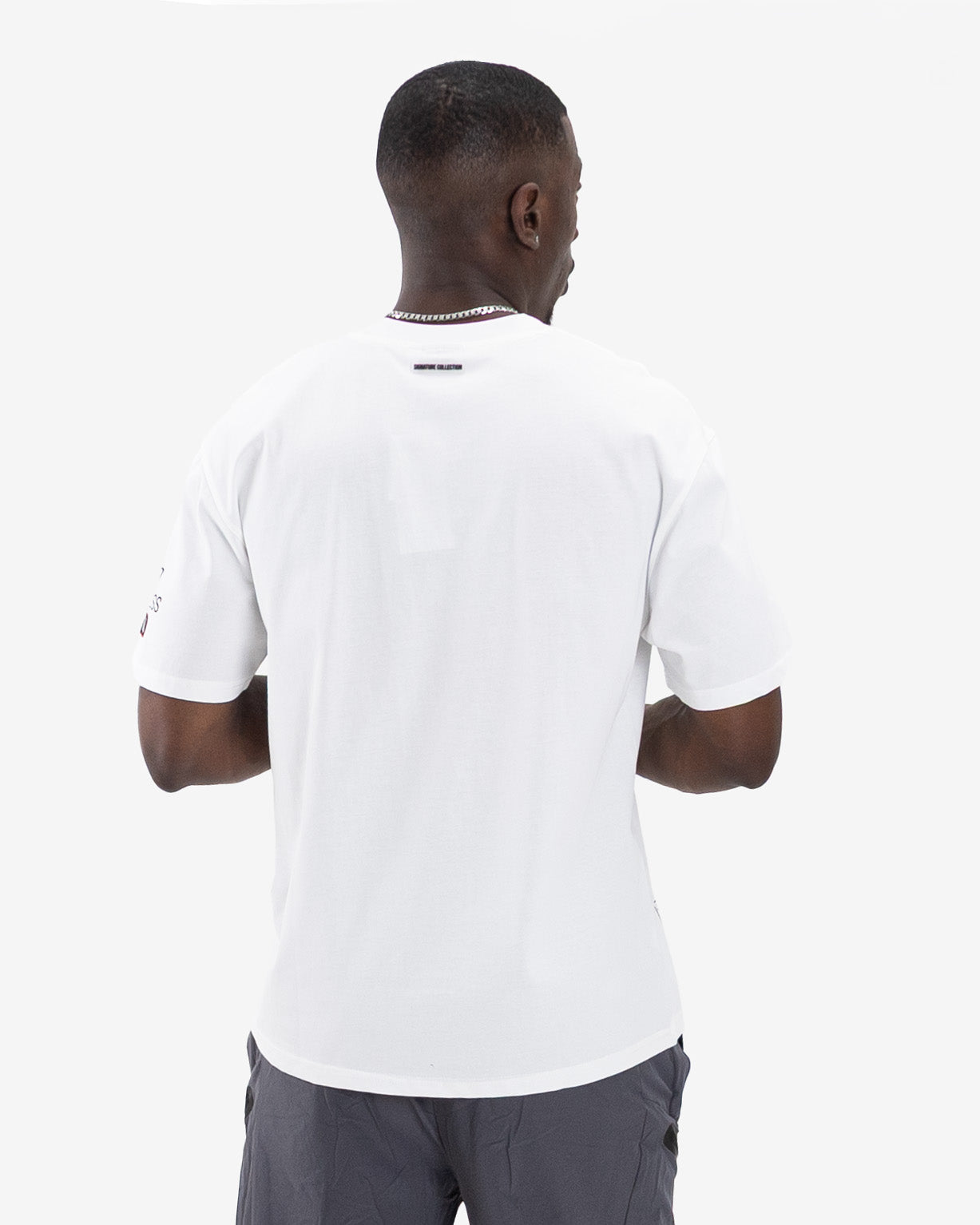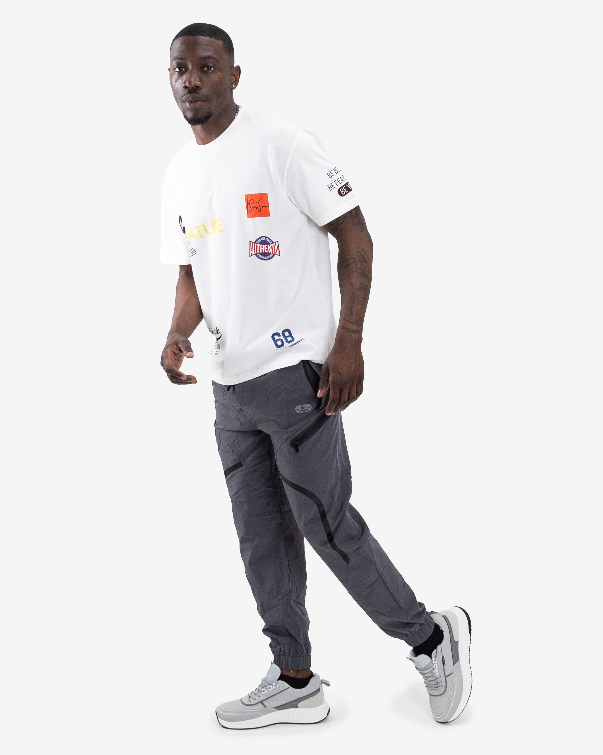 - Dynamic Aesthetic: The tee features multiple graphic patches and prints across the front, creating a modern, collage-like feel that's unique and eye-catching.